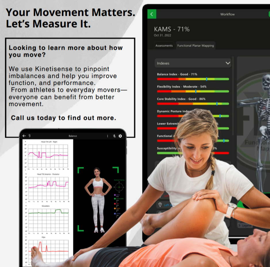 Kinetisense uses a 3D camera and smart software that records how your body moves, from head to toe. Instead of using sensors or special suits, Kinetisense uses a camera that gives us a full picture of how your body functions from all angles, not just from one angle or in a still photo.